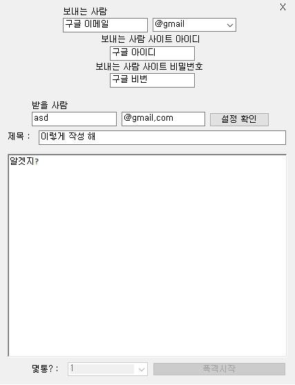 압축 풀고 Email_Bomber - bin - debug 안에 있는 exe 파일로 실행